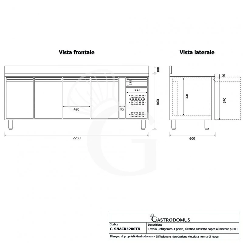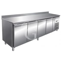 Tavolo refrigerato con 4 porte, alzatina, cassetto sopra al motore, profondità 600 mm e temperatura -2°C/+8°C – Classe energetica D .