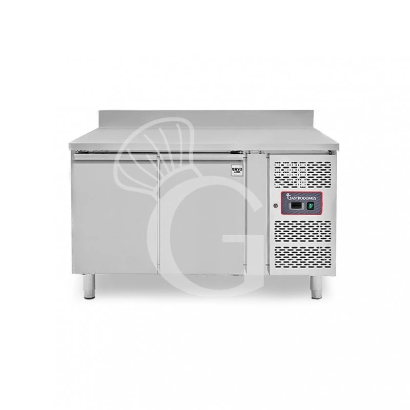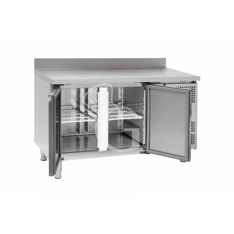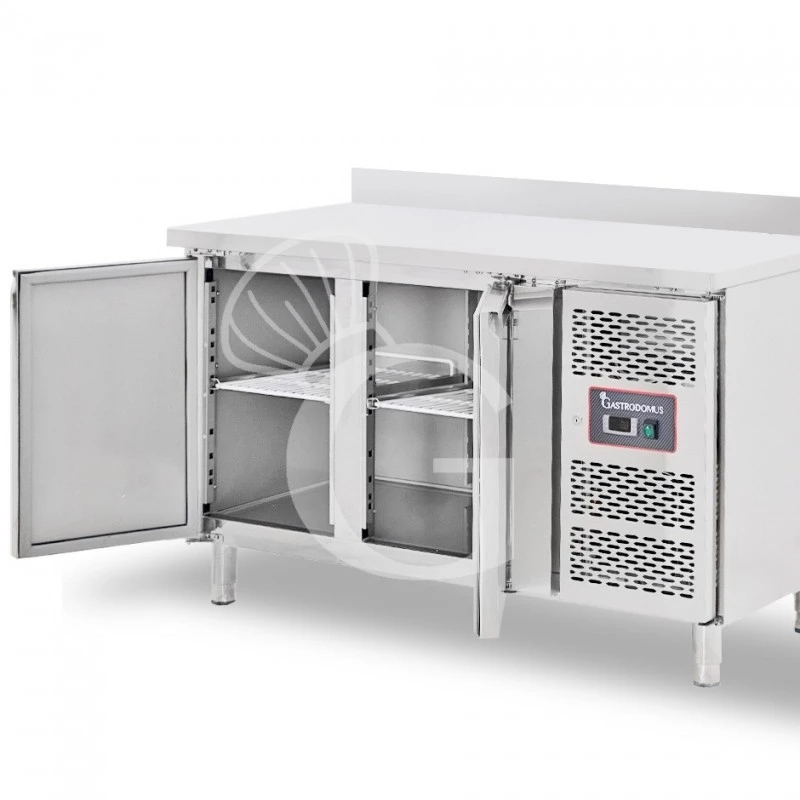 La refrigerazione è ventilata con evaporatore esterno ad alette trattato anticorrosione e ventola per uniformare la temperatura all’ interno del tavolo stesso. Il tavolo presenta anche un ricircolo di aria fredda. Il vano di produzione del freddo è situato infatti a destra e quindi, per distribuire il freddo equamente in tutta la larghezza del tavolo, è necessario incanalarlo in un controsoffitto che ha delle apposite feritoie che permettono di distribuire uniformemente l’ aria refrigerata in tutta la zona di stoccaggio.