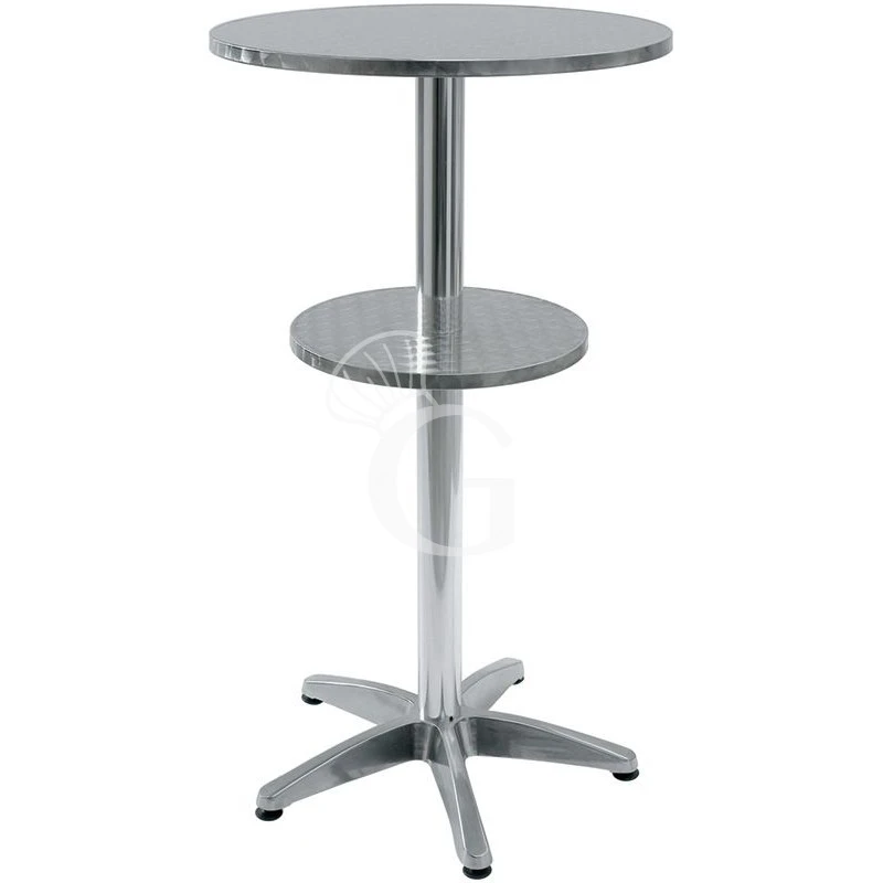 Tavolo rotondo da esterno di altezza 1060 mm con piano inferiore di diametro 600 mm, struttura in alluminio e piano in acciaio inox.