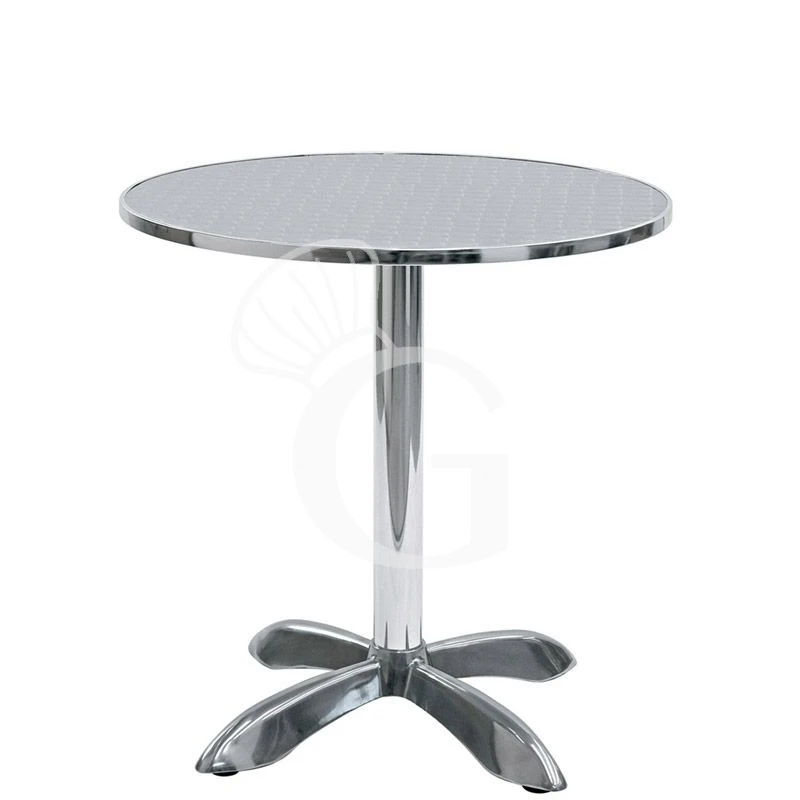 Tavolo rotondo da esterno con struttura in alluminio e piano in acciaio inox.