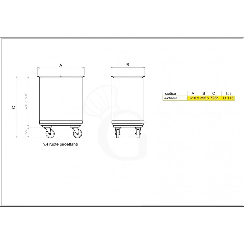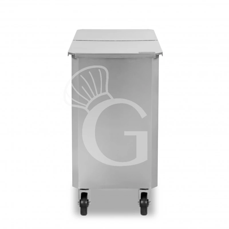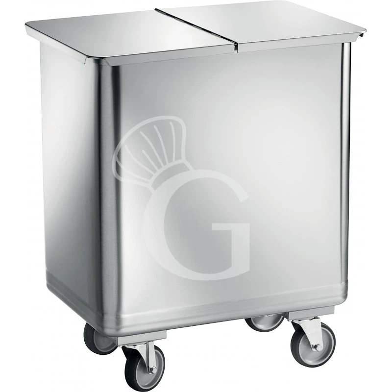 Tramoggia su ruote in acciaio inox satinato con separatore interno.