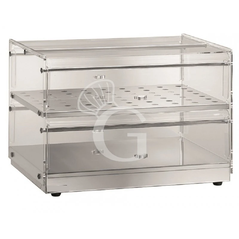 Vetrina neutra costruita interamente in acciaio inox con fianchi e antine sui due fronti costruite in plexiglass trasparente. La vetrina porta brioches e croissants è neutra e quindi non è nè calda nè fredda, pertanto è adatta per esporre e conservare gli alimenti.