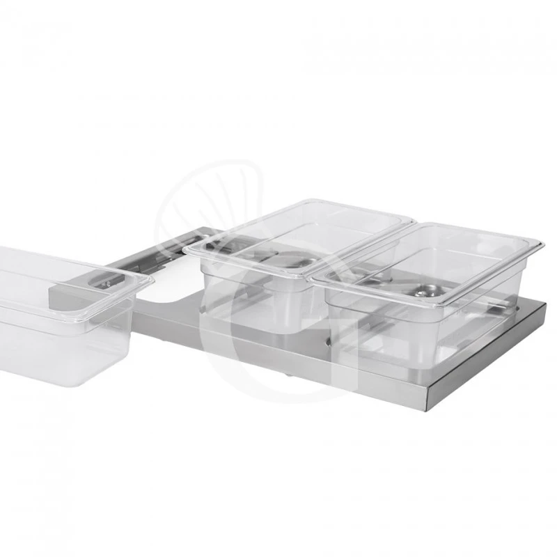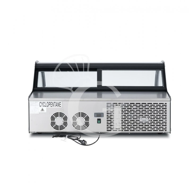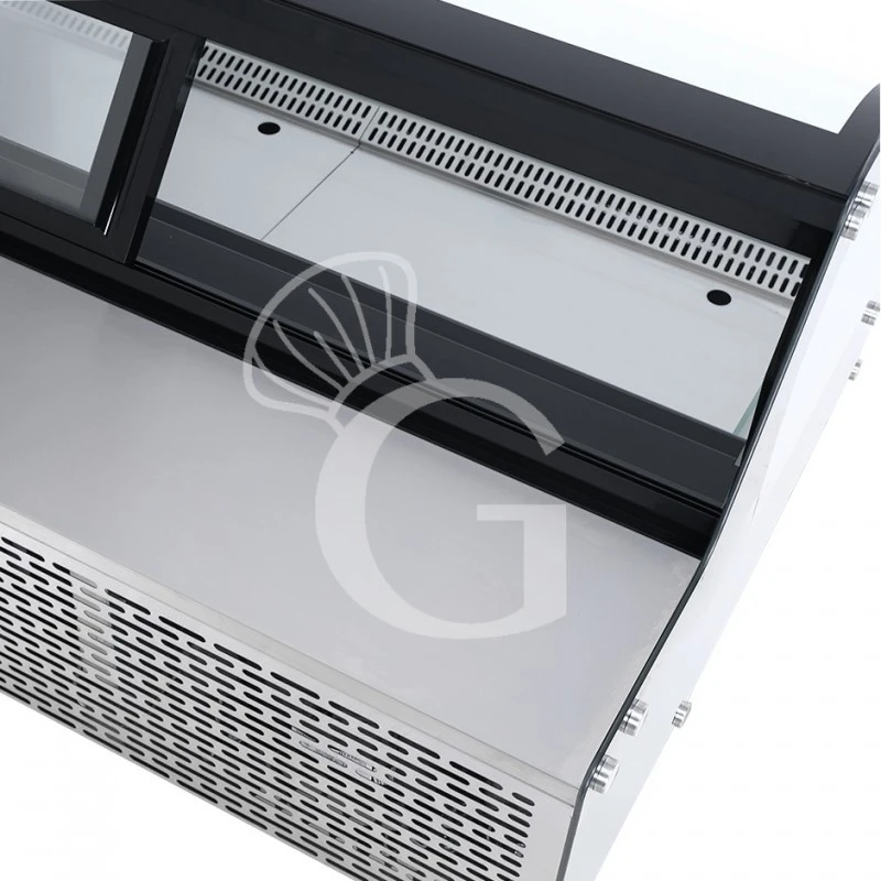 La refrigerazione è statica con gas refrigerante R404a. Sul lato anteriore della vetrina sono presenti 2 vaschette raccogli condensa.