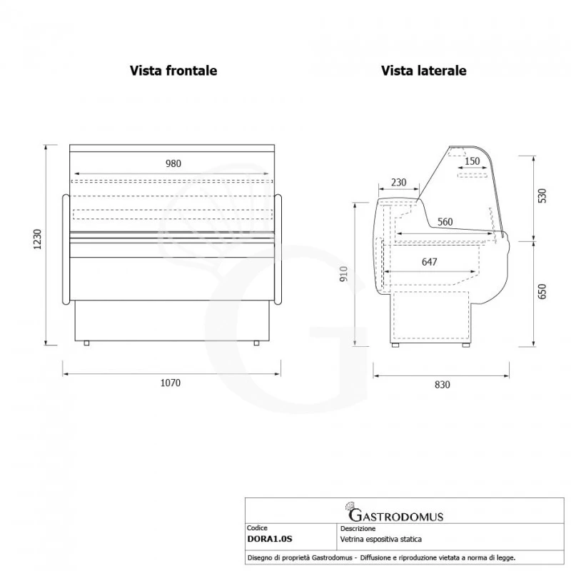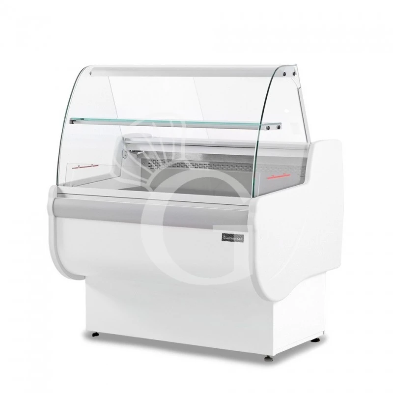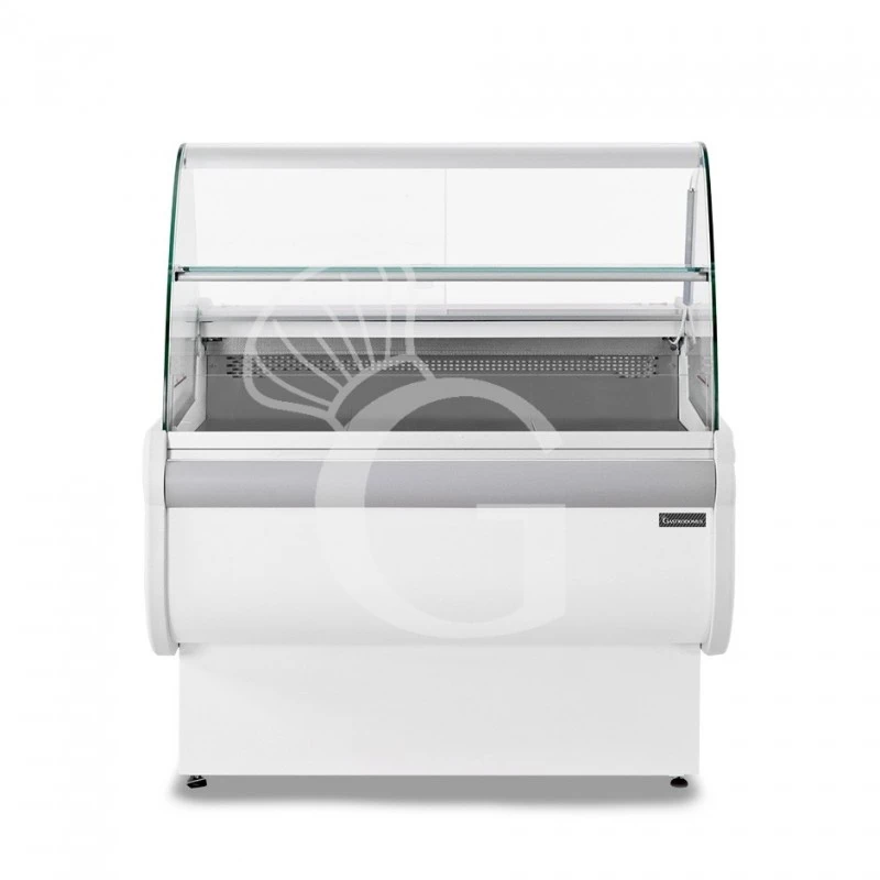Vetrina espositiva statica Dora full optional con vetro curvo frontale apribile, scorrevole in plexiglass, 1 ripiano in vetro, temperatura d’esercizio +1°/+10°C, lunghezza 1070 mm.
