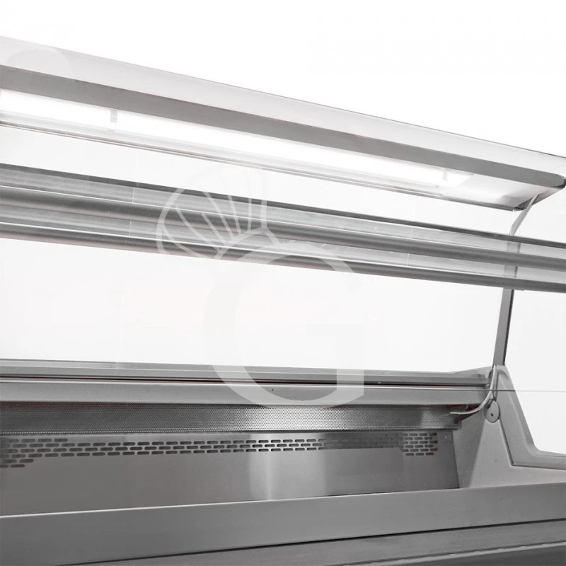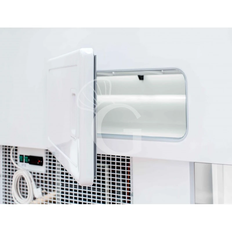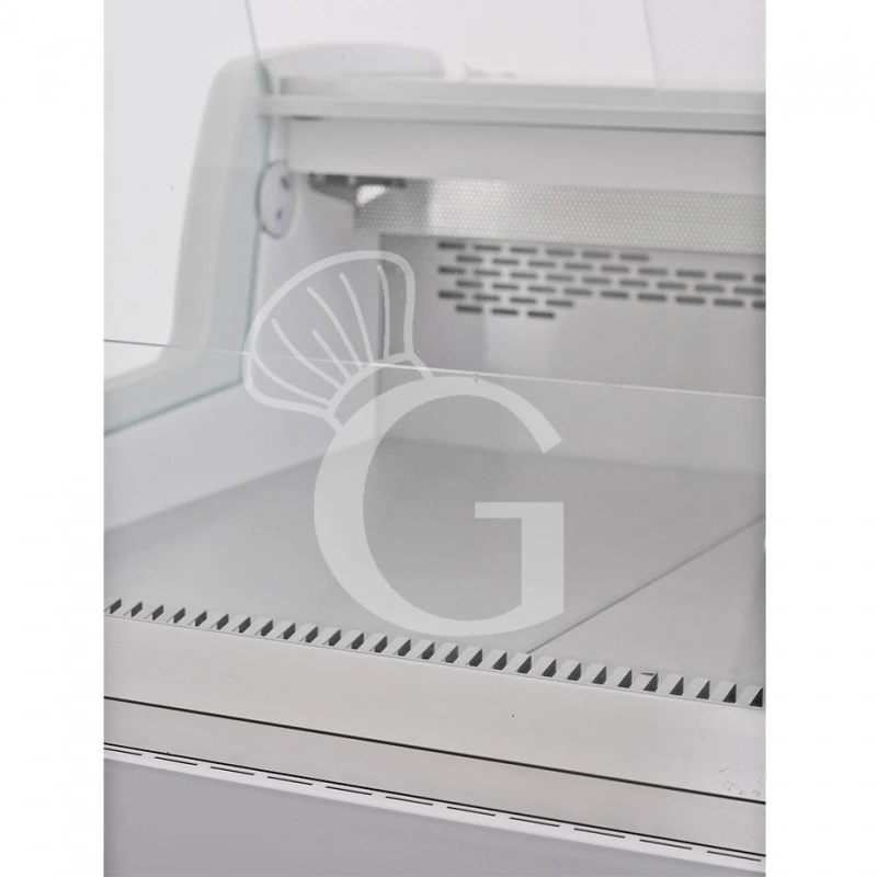 L’apparecchio presenta un’estesa area di esposizione costruita in acciaio verniciato bianco, visibile attraverso il vetro curvo apribile dall’alto verso il basso e i lati anch’essi in vetro. La vetrina espositiva è full optional e quindi ha in dotazione un ripiano di vetro di larghezza 150 mm.