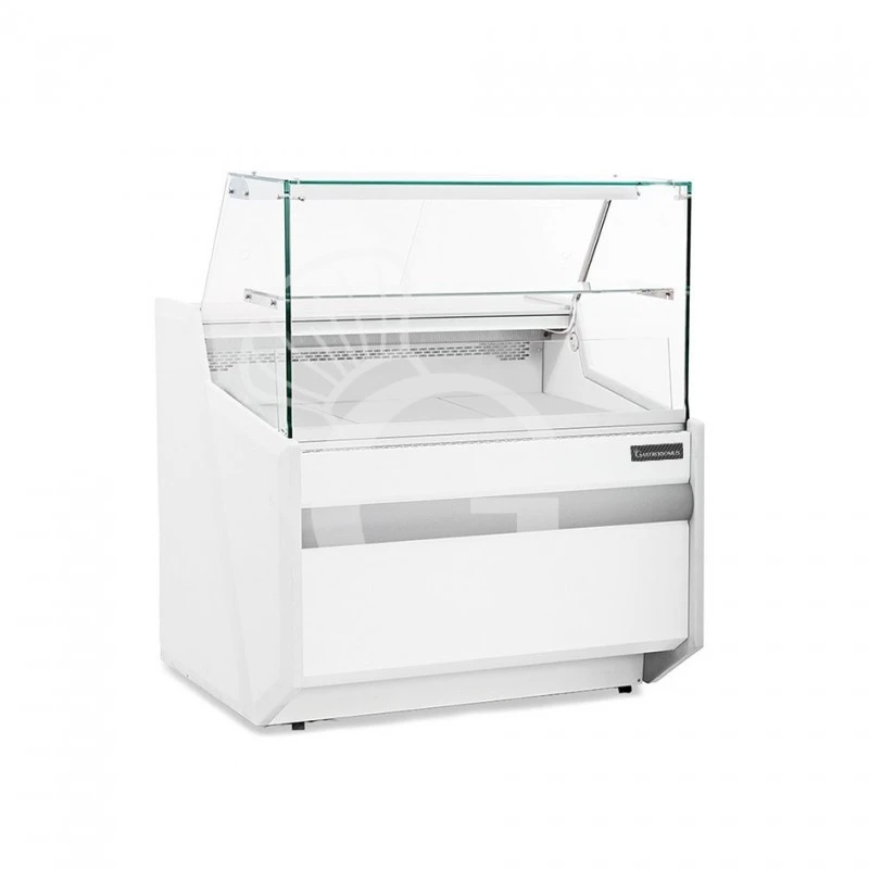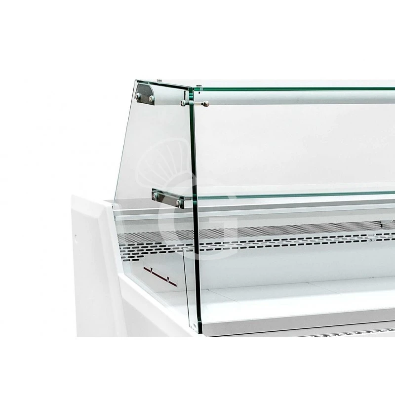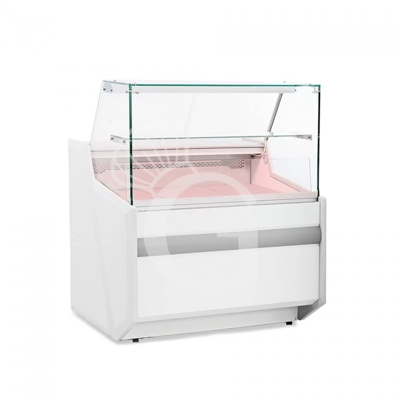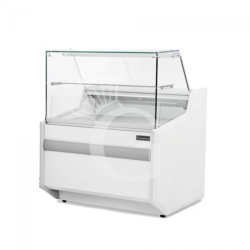 Ciò che contraddistingue la vetrina è il design moderno caratterizzato da pannelli frontali e pannelli di base costruiti interamente in acciaio colorato verniciato, elemento pratico e di facile pulizia. Ai lati del pannello sono presenti anche pannelli in vetro nella parte superiore e pannelli in plastica nella parte inferiore. Anche l‘area espositiva e la camera interna di stoccaggio refrigerata sono realizzati in acciaio verniciato bianco. La camera di stoccaggio, inoltre, possiede porte battenti.