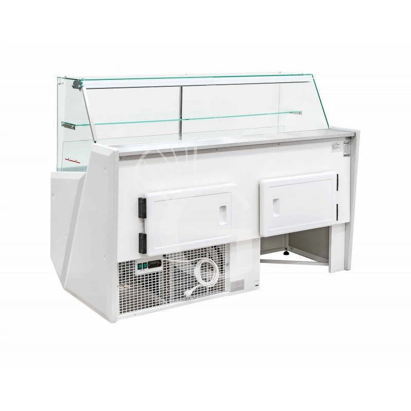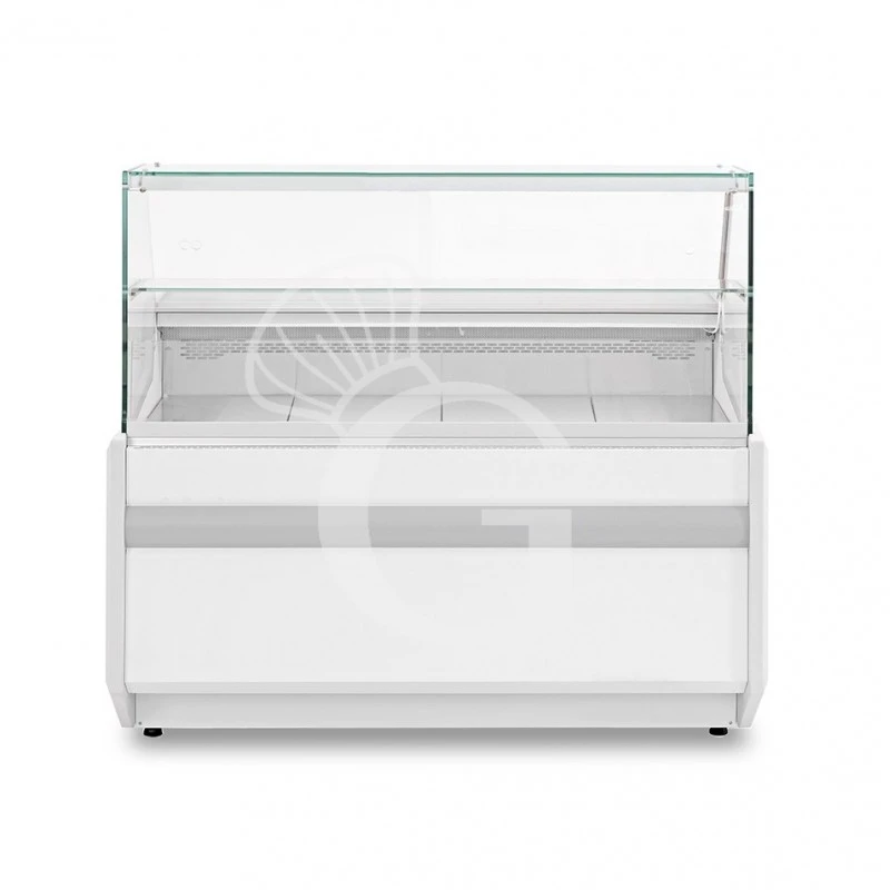 Ciò che contraddistingue la vetrina è il design moderno caratterizzato da pannelli frontali e pannelli di base costruiti interamente in acciaio colorato verniciato, elemento pratico e di facile pulizia. Ai lati del pannello sono presenti anche pannelli in vetro nella parte superiore e pannelli in plastica nella parte inferiore. Anche l‘area espositiva e la camera interna di stoccaggio refrigerata sono realizzati in acciaio verniciato bianco. La camera di stoccaggio, inoltre, possiede porte battenti.