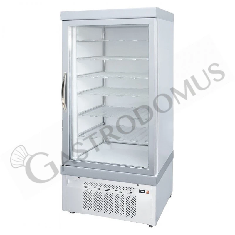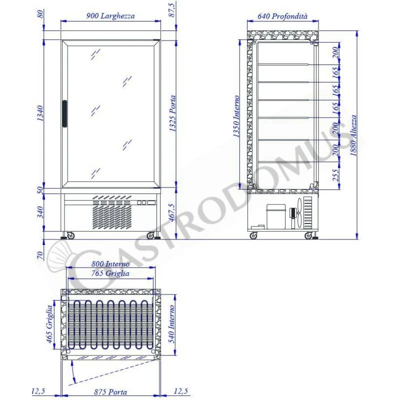 6 ripiani refrigerati fissi di 765 mm x 465 mm; 2 lampade neon; 4 ruote