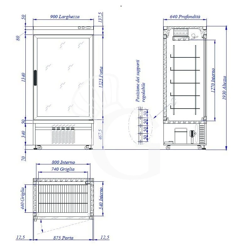 L’allestimento interno è composto da 5 griglie regolabili di dimensioni 740 mm x 440 mm o 5 ripiani in vetro.