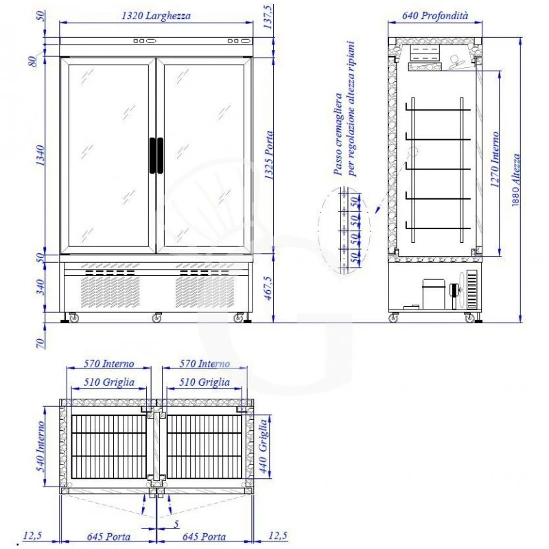 5+5 griglie regolabili 510 mm x 440 mm o 5+5 ripiani in vetro, 4 lampade neon, 4 ruote