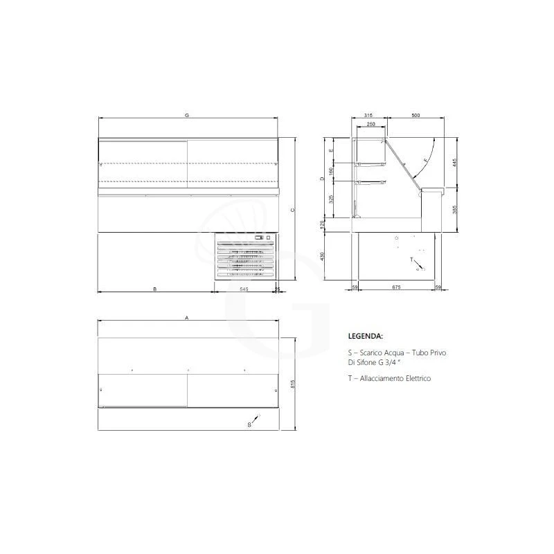 Vetrina refrigerata ventilata sandwich con 2 ripiani, vetro dritto lato cliente, 2 sportelli in plexiglass lato servizio e unità refrigerante. Temperatura + 3 °C a +10°C.