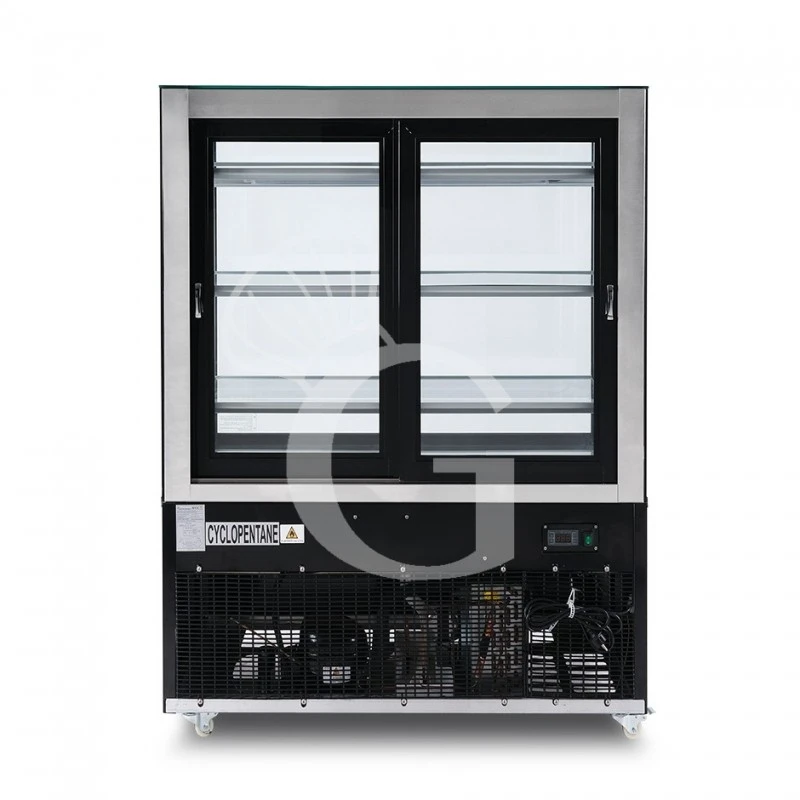 La struttura esterna è in acciaio con porte scorrevoli in vetro non invertibili. Le vetrine hanno doppi vetri su tutti e 4 i lati e il pannello frontale è facilmente accessibile per permettere una perfetta pulizia del condensatore.