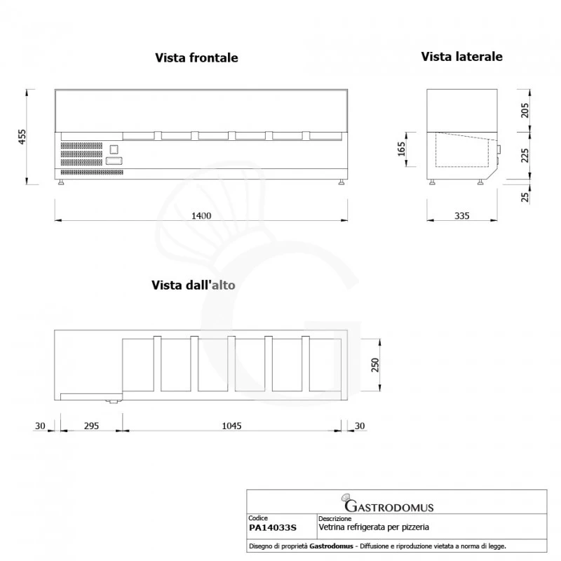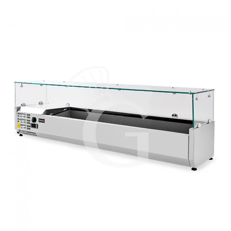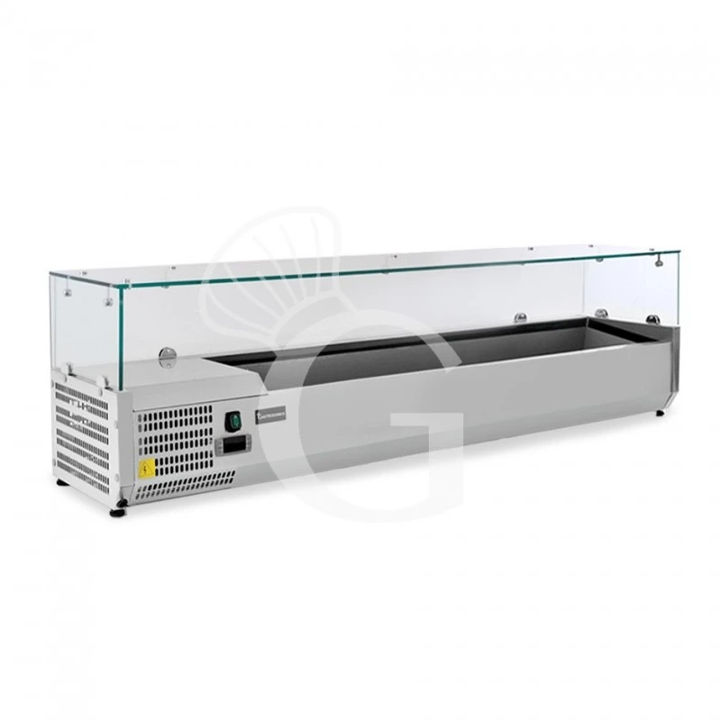 Vetrinetta refrigerata per pizzeria con motore a sinistra, lunghezza 1400 mm, predisposta per 6 bacinelle GN1/4.